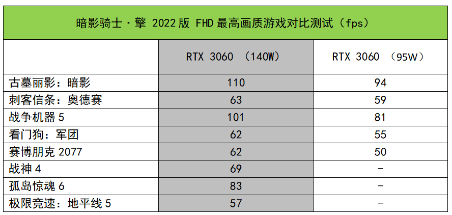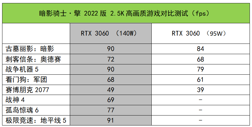 Cow叔叔加入了95W RTX 3060, 作为FHD高图形游戏测试的匹配, 向您展示了 2022年影子骑士猪猪的全面操作性能。
