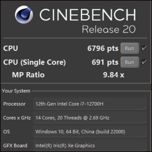 C4D投标是一种合理的比较。软件版本和测试项目完全一致。黑暗骑士波恩, 2022年版本的i712700H, 运行过51个框架 16分47秒。末帧耗时为21秒。上一代的i7 11800H 需要22分32秒末帧耗时27秒。从这里你可以看到 在你退出投标后不同产品代之间在效率方面有显著变化!