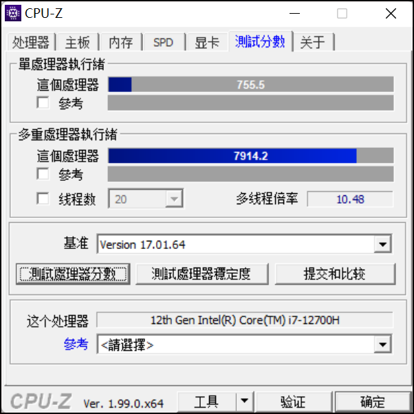CPU-Z基线测试(i7,1270H)在多条线路上获得了7914项,在单条线路上获得了755项,也达到了极高的水平,在i7,11800H上远高于5,800项,增幅为36%。