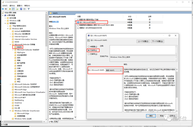 在小组战略编辑中,为Windows Defends 反病毒MAPS找到一个计算机配置模板管理模块。