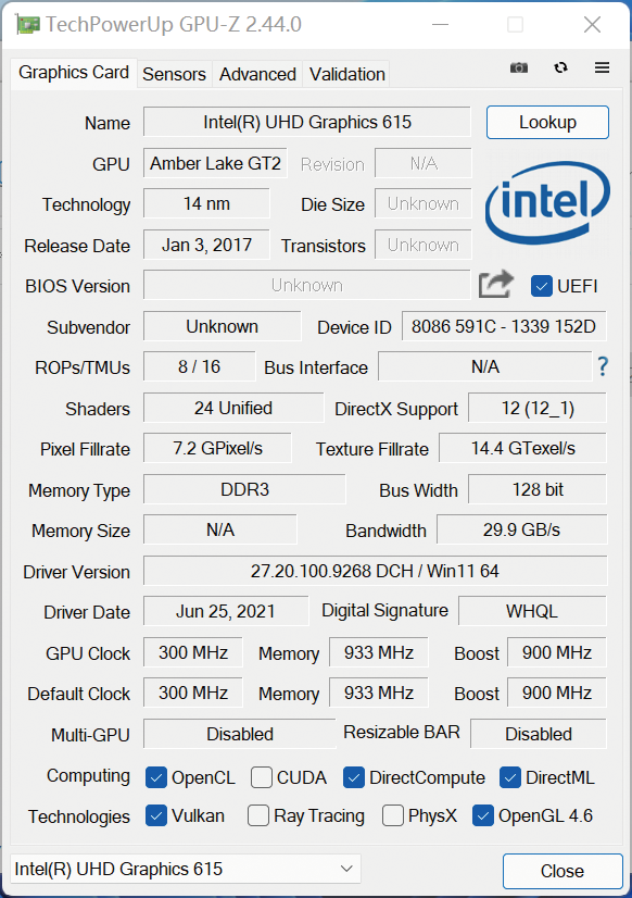 UHD 615核显示器(UHD 615核显示器)已并入CPU, 该系统正在使用。