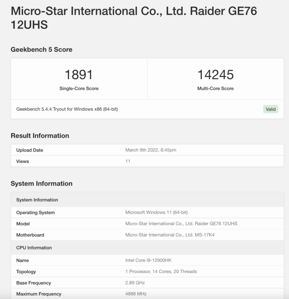 另一方面,最伟大的Geekbench成就可能是在大约1900年加上14200+的单一核心中,这种配置在笔记本电脑上已经被归类为非常强大的,尽管这个处理器并不是12代移动专门知识中最强大的人。