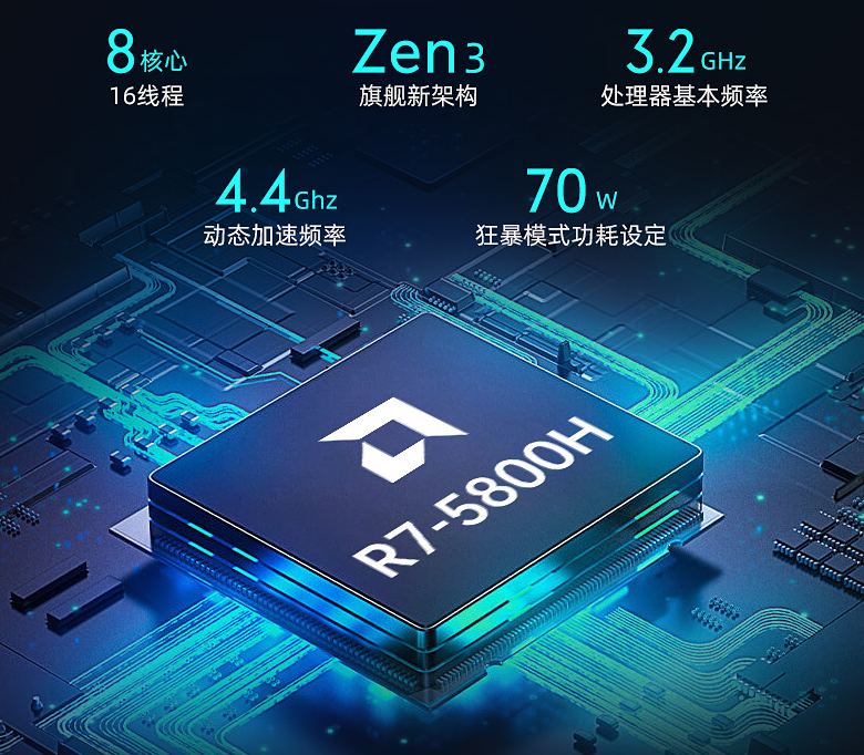它使用R7-5800H处理器,有8个核心和16个线条,基频率为3.2GHz,动态加速频率为4.4GHz,45W功率,最大功率为70W。