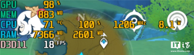 目前,温度已达到71°,没有在随后连续操作中上升;CPU频率同样波动在1200兆赫;框架率不变,大约在18个FPS;游戏仍然可以不战而胜。