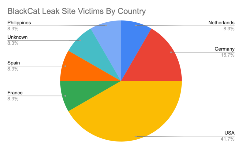 通过泄漏网站信息,显示受黑猫攻击影响的受害者的地点和类型。受害者包括建筑和工程公司、零售、运输、商业服务、保险、机械、专业服务、电信、汽车零部件和药品。以下地图按国家/区域说明伤亡地点。然而,到目前为止,攻击的零散扩散可能意味着一种相当投机的战略。完全像大多数 新的勒索软件家庭。