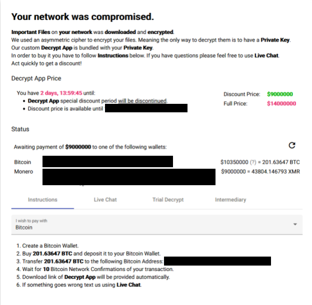 42股发现黑猫公司参与其中,要求赎金高达1 400万美元。但是,如果在最后期限之前支付,赎金价格可以降低到900万美元。有趣的是,受害者不仅可以支付比特币(最受欢迎的选择),还可以支付比特币。以门罗语支付也有可能。