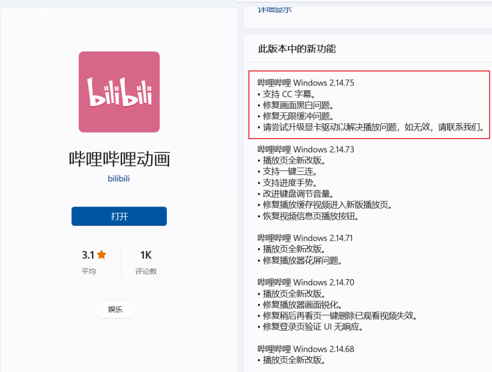 B站哔哩哔哩动画 UWP 客户端 2.14.75 正式版更新