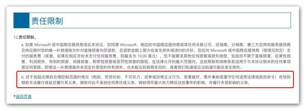 微软公司不接受因不可抗力造成无法或迟到履行义务而承担的赔偿责任或义务。