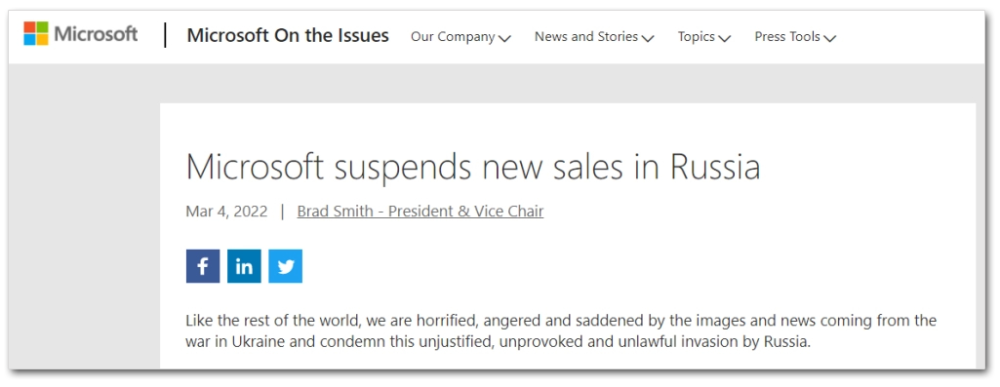 微软公司最近表示,它将停止在俄罗斯的所有服务和销售。