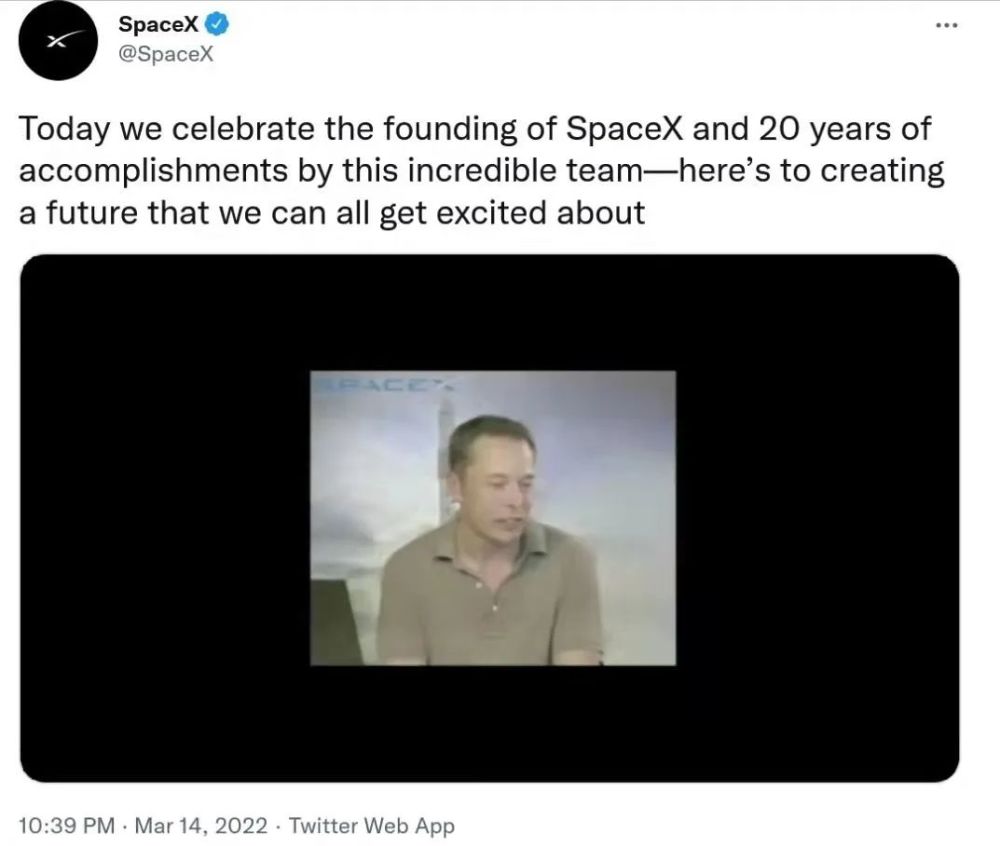 SpaceX于2002年3月14日成立,此后一直积极开展活动,为纪念其成立二十周年,该公司于当地时间星期一出版了一个审查录像。