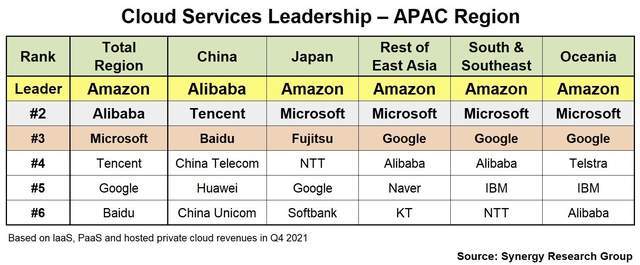 一家在互联网和电信行业工作的市场情报和分析公司 " 协同效应 " 编写了一份关于国家状况的研究报告。根据最新数据显示,亚马逊(AWS)、阿里巴巴(Ali Baba)和微软(Microsoft)是亚太云计算行业的市场领先者。在五个亚太地区中,有四个地区由亚马逊地区领导。他是该地区其他比赛的先锋微软在四个分区域中位居第二。亚太区域总共第三次。小倩现在在亚太地区排名第四。高于谷歌,与此同时,100度正在实时做云计算任务。