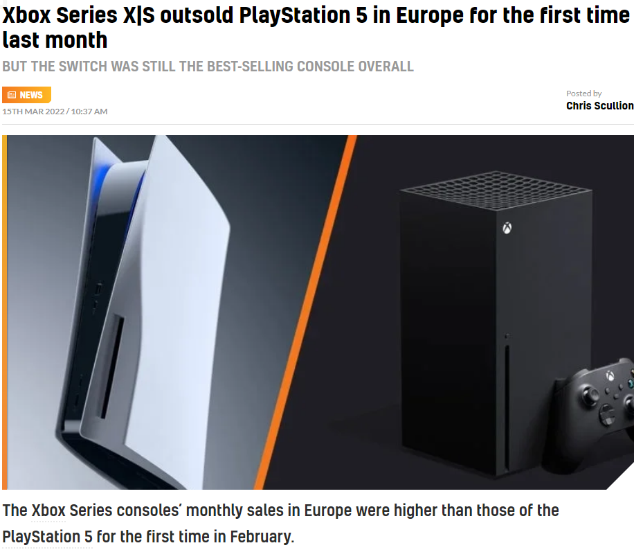 根据GSD市场数据,欧洲的微软Xbox系列X/S销售量在2月首次超过Sony PlayStation 5, 据外国媒体VGC3月16日报道。