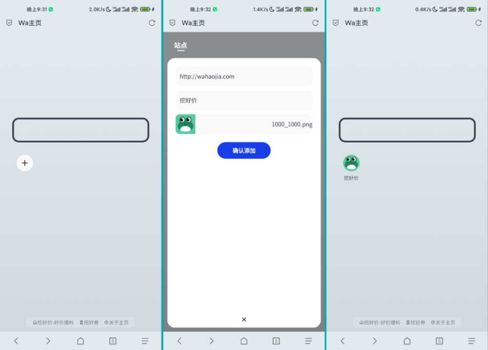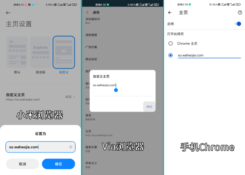 例如,移动电话使用小米浏览器、Via浏览器和铬浏览器,为了创建自定义的主页,只需输入一个域名。