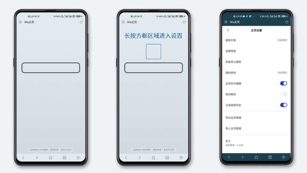 使用小平方块和主页搜索框上的长按键,您可以输入主页设置。