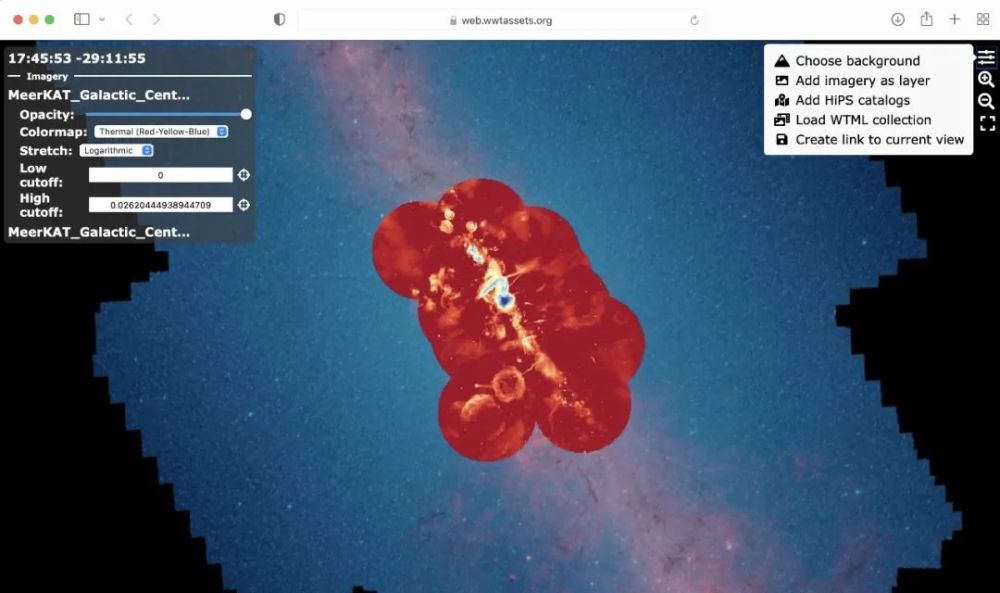 见银河中心以网络模式提供的MeerKAT无线电数据图片。