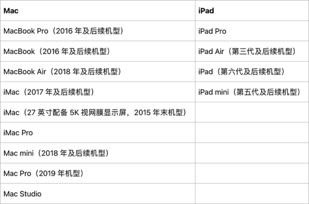 根据苹果公司官方网络脚注,通用控制能力适用于下列装置: