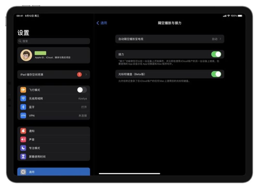 系统升级到上述版本后,iPad 可以在配置中发现光标和键盘(Beta 版本)开关- 常规- 断开播放和连接。 激活它并遵循在iPad上设置通用控制的指示 。