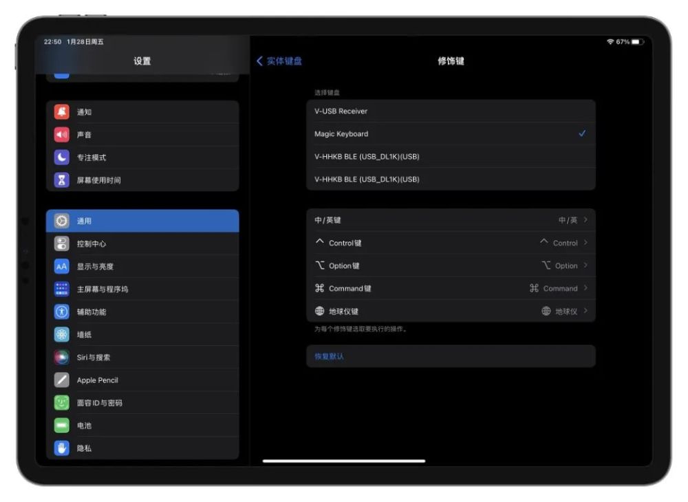 在 " 普遍控制 " 连接的案例中,在设置过程中无意中发现了这种情况:iPad - 通用 - 键盘 - 实体键盘 - 修改键我们可以看到,现在与iPad相连的键盘包括了以V开头的Mac键盘;同样,Mac的“系统偏好”包括以V开头的Mac键盘。