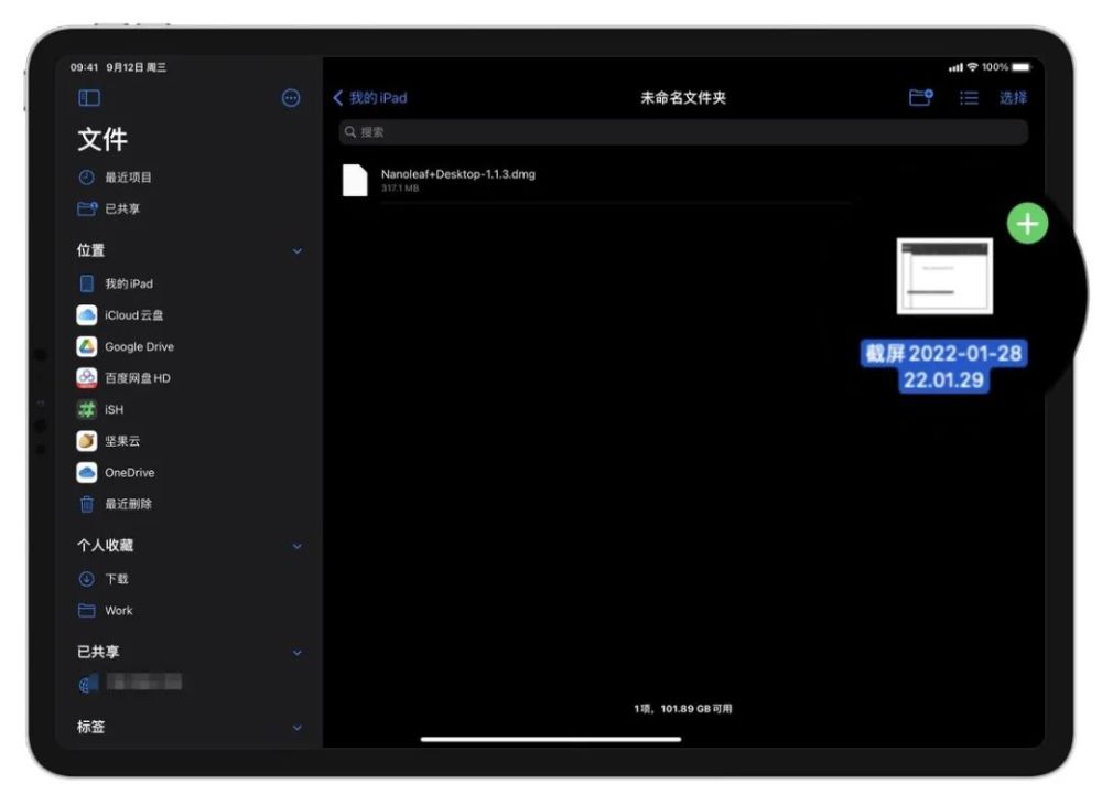 当从 Mac 拖动文件到 iPad 文件应用程序时, 效果如下: