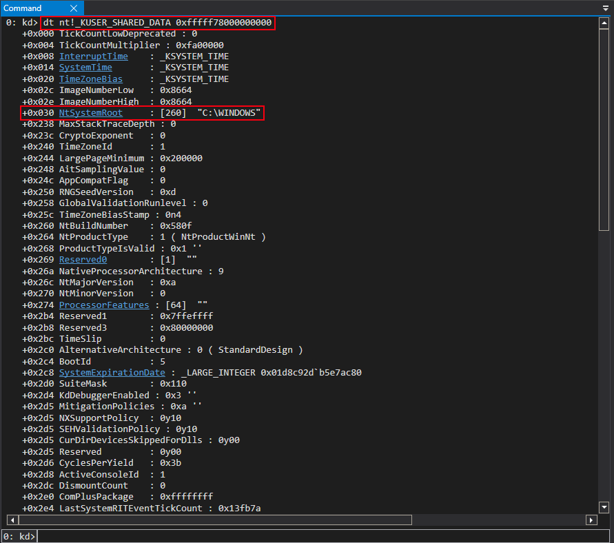 可更改 Kuser_ Shared_Data 。我的第一个想法是,记忆地址会在某个时候(以某种方式)完全随机化。为了验证这一点,使用 WinDbg, 我将 Kuser_ Shared_ DATA 结构的静态地址给了 dt 命令 。令我惊讶的是,拆除后,可在0xff 78万 00 00个工地找到施工地点。