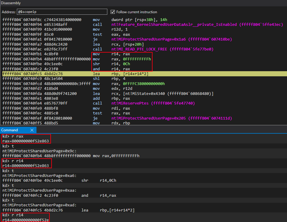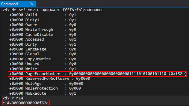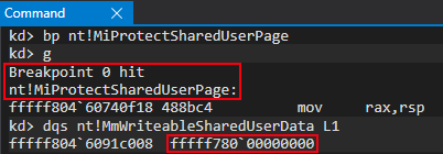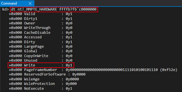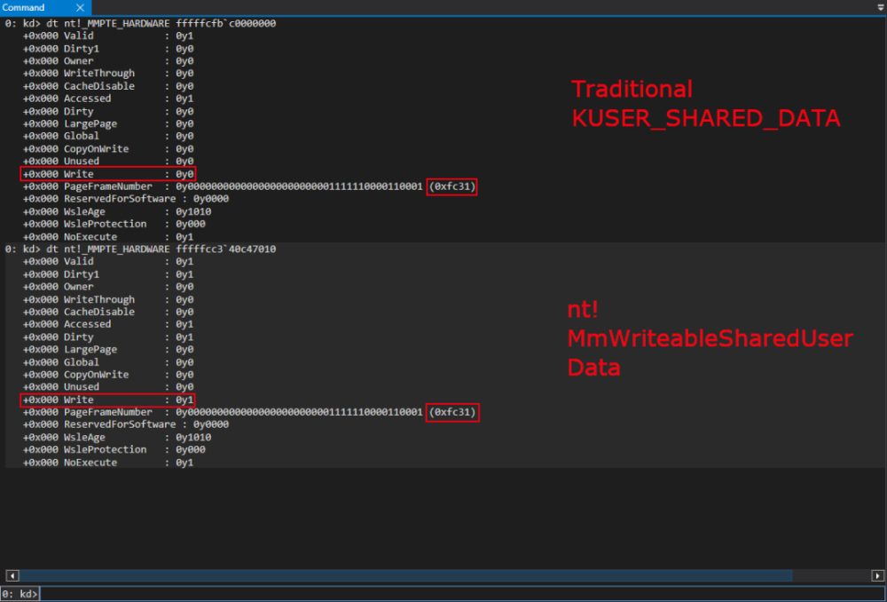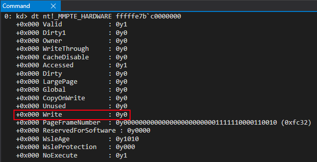 我的下一个想法是,它试图用 0x800 作为冲抵。Kuser_Shared_Data 结构创建,确定是否发生了任何事故。执行该操作后,通过检查PTE,Kuser_Shared_Data现在只读,正如我们所发现的那样。