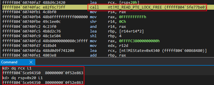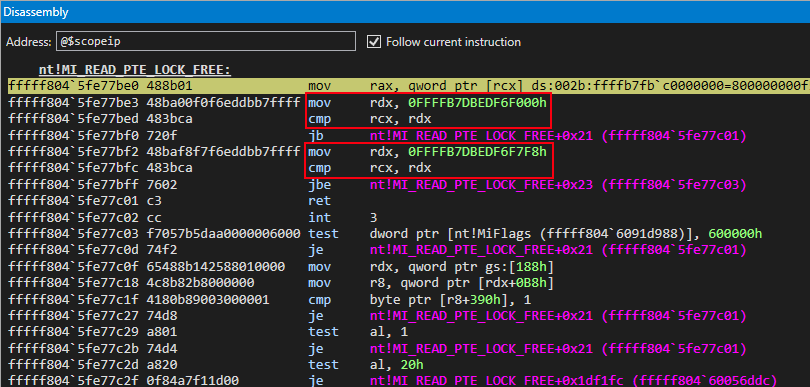 这意味着连接“静态” Kuser_Shared_Data 结构的 PTE 将引入nt! MI_ RED_PTE_LOCK_FREE。 上述 PTE 的地址是 0ffb7fc00。