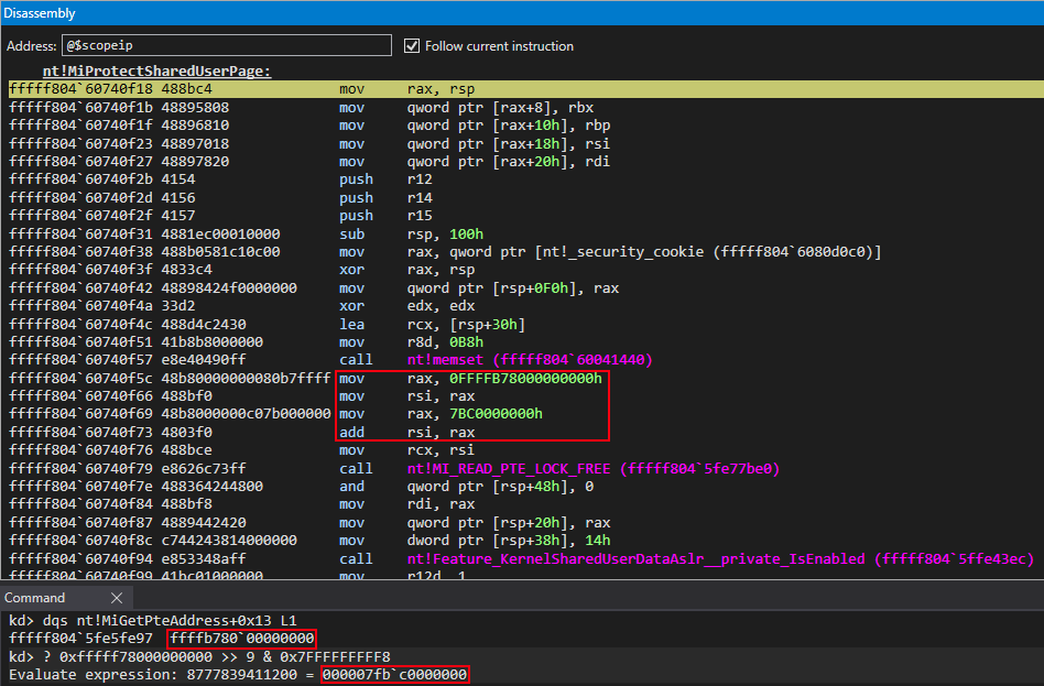 在上图中,内核模式为 0xffb700。在 WinDbg 的重新组合窗口中标记红框 。事实上,它是该列表项(例如PTE阵列的地址)的页面基本地址。第二个值,这是 0x7bc00 常数 。用于定位此 PTE 阵列的值 。获取与 KUSER_Shared_Data 连接的 PTE 数据 。以下公式可用于计算这个数字(PTE阵列的索引):