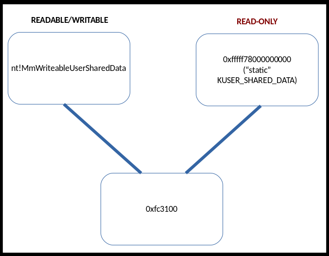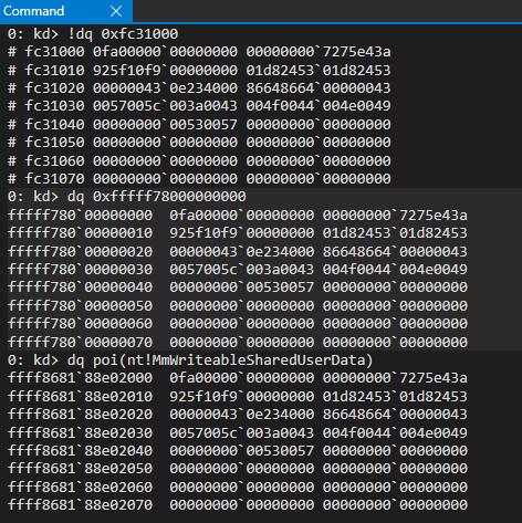 这需要改变一个虚拟地址(如nt)!同时,将修改另一个虚拟地址(0xff7800)的内容。这是因为一个虚拟地址内容的任何变化都会导致对物理内存进行更新。由于这一物理内存的内容由两个虚拟地址共享,所以,两个虚拟地址的内容都将更新。允许 Windows 在保存前一个 Kuser_ Shared_ DATA 地址的同时保存此地址 。还可以随机生成新的地图视图 。先前在 Kuser_Shared_DATA 结构中发现的静态读写代码缺陷已被“ 缓解 ” 。“ 旧” 地址 0xff7800 现在可指定为只读 。因为有一个新的视角可以用来取代这个内存。这种观点是不合逻辑的!我们现在对已经取得的成就提出了更为复杂和低层次的具体细节。