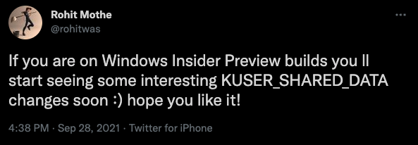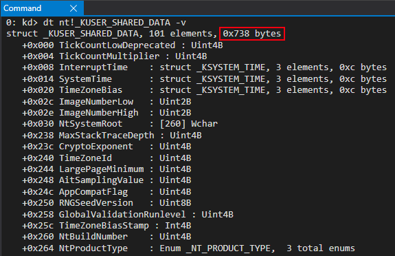 在编写本报告时, Windows 11 目前内部预览版本中的 KUSER_Shared_DATA 结构长度为 0x738 字节。