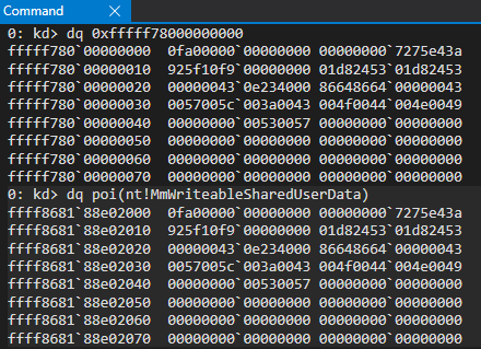 在继续分析之前,让我定义两个词。当我指定存储位置 0x7800 (KUSER_Shared_DATA 静态地图) 时,我将Kuser_Shared_Data称为“静态”。当我介绍新的随机地图时,很多人对此感兴趣。我称这个符号为nt! MmWrityable SharedUserData。这样的话,我总能指出我所说的"转变"