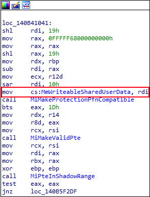 因为我们知道 0xff7800,这个“ 静态” Kuser_ Shared_ Data 结构的地址,在某些时候,它会变成只读。这意味着这一职能可能负责改变地址的权力。并动态地弹射 ent! MmWribable SharedUserData 。它特别以命名契约为基础。