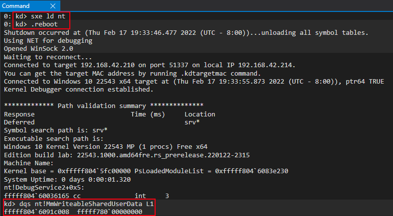 我们可以看到新找到的符号 ent! mmWrityableUserSharedData 与“静态” Kuser_Shared_DATA 位置的链接, 一旦达到断点 。