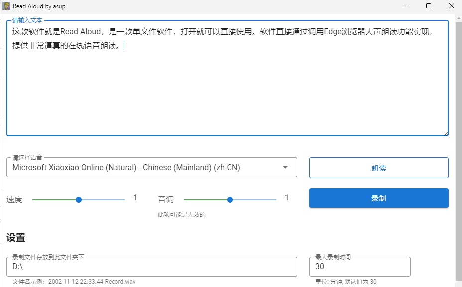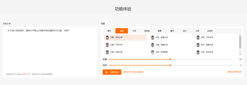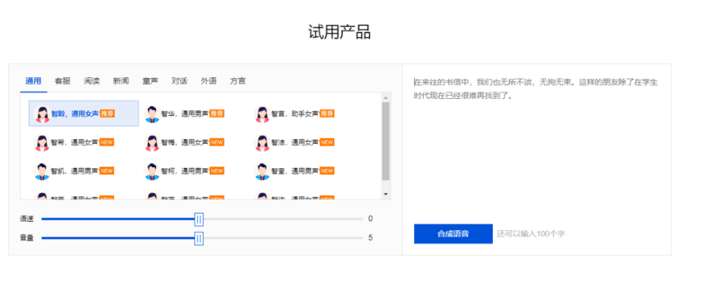 Tsingyun的声音合成试验版本最多有100个字,与Aliyun的相同。