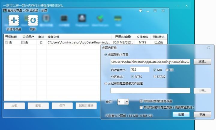 之后你会看到软件的接口操作非常简单啊,创建内存盘,选择分区格式,然后决定板块和分区的大小,以及启动和关闭设置。以下是一个观察:我们的电脑有8GB的内存。WIN7 64的可用容量超过4G。如果内存不足,在该条的最新版本中,可以考虑使用记忆整合工具。