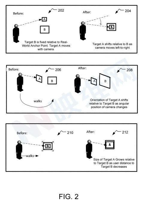从另一个角度看 210,第一个数字目标(A)和第二个数字目标(B)的大小可能不同。尽管他们指向使用者的眼睛方向,但他们指向和平的方向。这意味着用户与视觉对象的分离与指定的有利位置不同。在该示例中,当用户为第二个数字目标(B)走向一个设定的现实世界点时,将出现下列信息:初始数字目标(A)的大小有所扩大。用户在向相反方向移动时向另一方向移动。初始数字目标(A)的大小已经降低。如视图212所示。值得注意的是,可以利用各种视觉效果来传播同一想法。