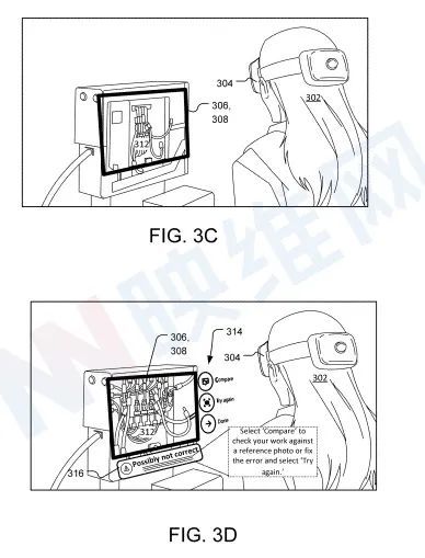 图3D显示了图片检查工具的示例菜单选项314。如图3A-3C所示,当拍摄时,可以显示图像检查工具。这里,混合现实图形用户界面包括314模式菜单选项,作为其中的一部分。菜单选项 314 包括选项“comparare”、“retry”和“finish”。当用户选择“比较”选项时,例如,图像检查工具可以从数据库中获取参考图片。然后我们看一看照片, 然后我们一看照片, 然后我们一看它们, 我们会一看它们,我们一看它们, 我们一看它们,我们一看它们, 我们一看它们,我们一看它们, 我们一看它们,我们一看它们, 我们一看它们,我们一看它们, 我们一看它们,我们一看它们, 我们一看它们,我们一看它们, 我们一看它们,我们一看它们, 我们一看它们,我们一看它们允许人们主观分析这两张照片的相似之处和不同之处。例如,拥有一个无缺陷产品的参考图像 是一个好主意。使用户302能够确定新拍摄的照片中显示的物品是否有问题。