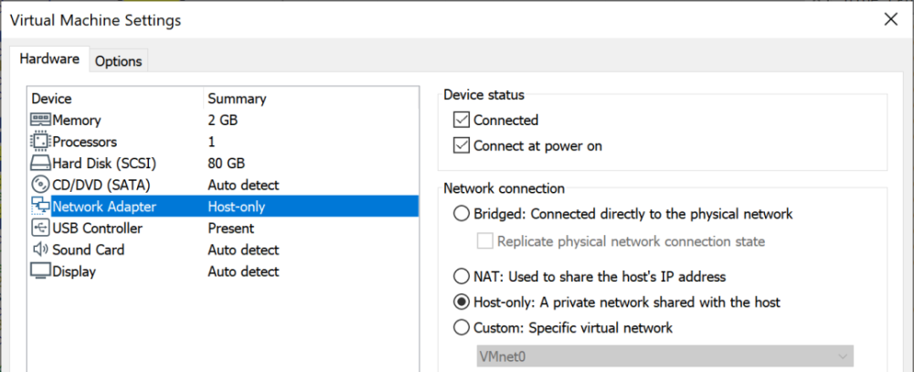 改变虚拟机的网络设置,使其没有任何网络访问。例如,在VMware Workstation Pro中,你可以通过进入虚拟机>设置...>硬件>网络适配器并选择 "仅主机",将其放入 "仅主机 "模式。