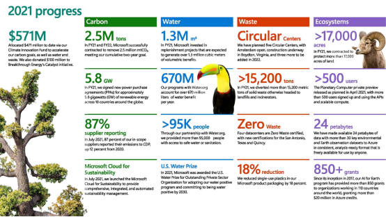 微软公司发表了2021年环境可持续发展年度报告[1] (下称“报告”),其中评估微软公司在2021年为实现负碳排放、积极的水资源效益和零废物的“2030年目标”所作的努力。