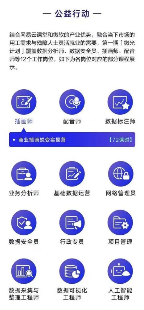 就业是民生之本,目前,全国约有8 500万残疾人。另一方面,残疾人的就业率较低。帮助残疾人就业,帮助他们更充分地融入社会 是个很棒的主意而是要承认自己的价值中国促进残疾人事业信息和宣传组织负责该项目。与微软公共利益公司合作,在网上云层教室发起了“微光项目”。各类残疾人可以免费在线职业教育课程。
