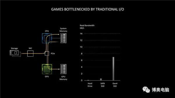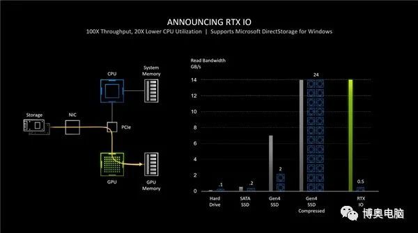 NVIDIA RTX IO技术,用于RTX 30系列,实际上,它背离了直接标准API(与荷兰竞争管理局和微软DXR API一起)。这是运用N卡技术的方法据官方称,投入/产出绩效比通常的硬盘存储速度快100倍。CPU占用率可以降低20倍。
