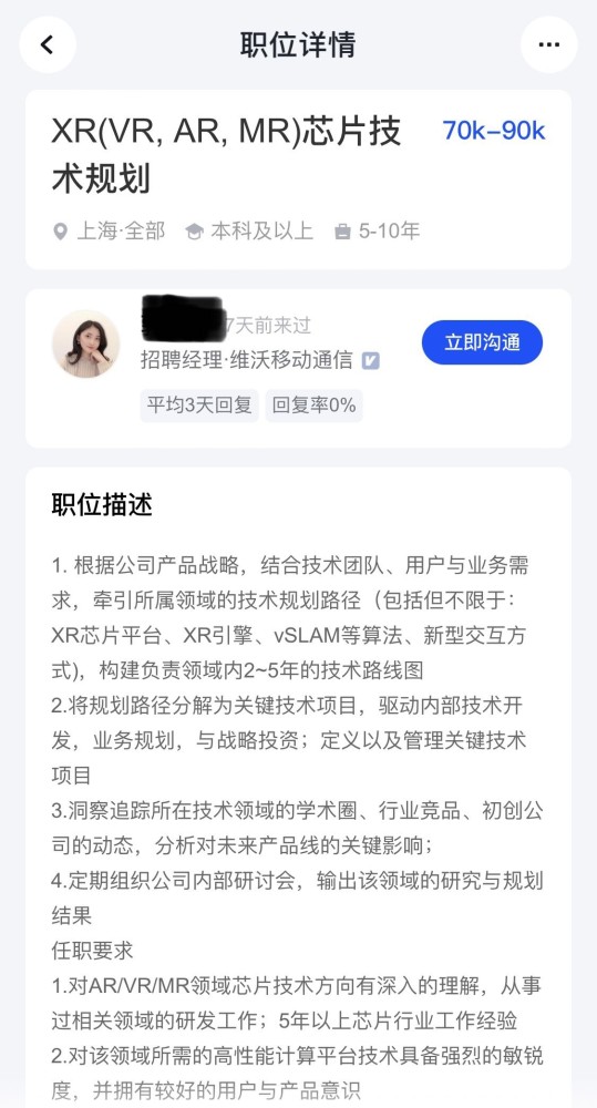维沃刚刚发布招聘信息,寻找能够计划XR(VR、AR、MR)芯片技术并每年支付数百万美元的人。