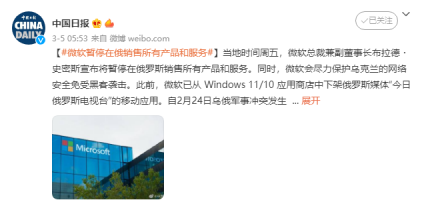 微软作为个人电脑的领头人,从Windows Store(Windows Store)调出俄罗斯媒体“今日俄罗斯电视”等节目。 3月5日,微软宣布俄罗斯的所有服务和销售将停止。