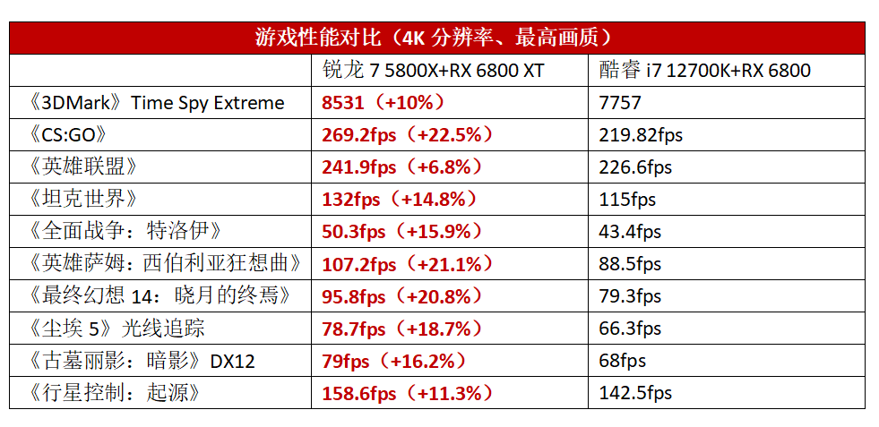 如性能测试表所示,如果整个装货费用具有可比性,就赌博性能而言,已知拥有75800X+RX 6800 XT组合的东道主是7 12 700K主机的赢家。《Hero Sam 西伯利亚精神病学》,CS:GO和《最后幻想14:小春的终结》,《最后幻想14:小春的终结》。业绩优于20%以上。除了英雄联盟有些游戏的成绩超过10%。