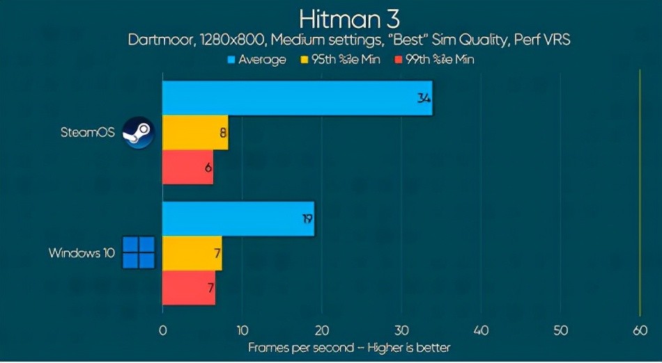在测试中,所有三场比赛的框均大于同一照片中的Windows 10,其中杀手3在SteamOS下平均为34, Windows 10 平均为19。