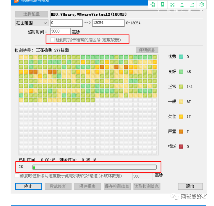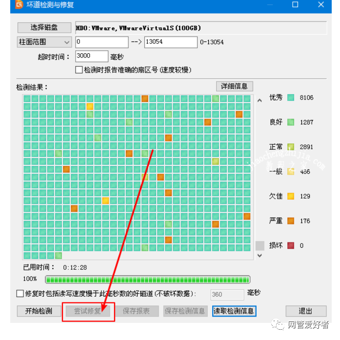8 - 延长测试时间, 并要有耐心。 当测试完成时, 如果测试显示路径差, 则点击“ 试图修复” 重新启动测试 。