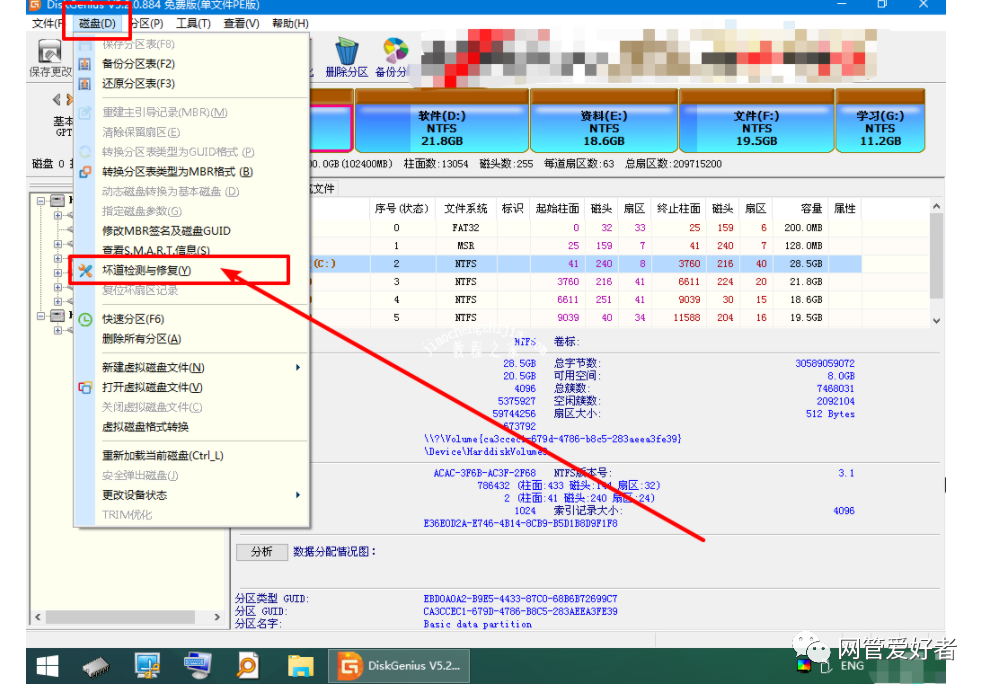 4. 其次,在接口上方,点击磁盘 -- -- 坏轨道探测和修理 -- -- 坏轨道探测和修理。