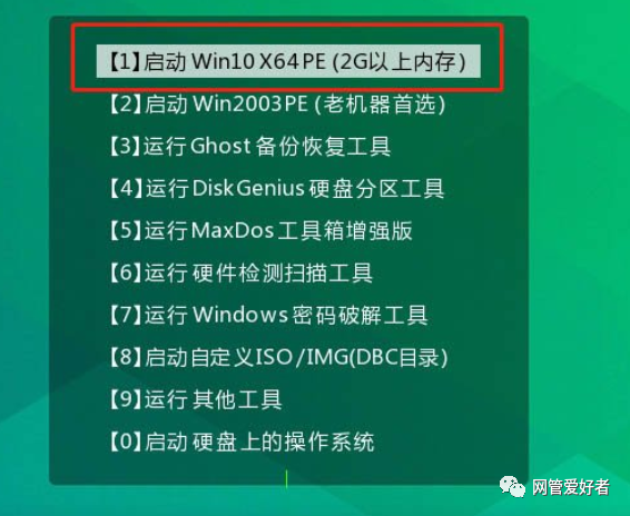 2. 在访问温普主菜单并返回温普桌面后,选择[1] Win10X64PE(2 G+ RAM)