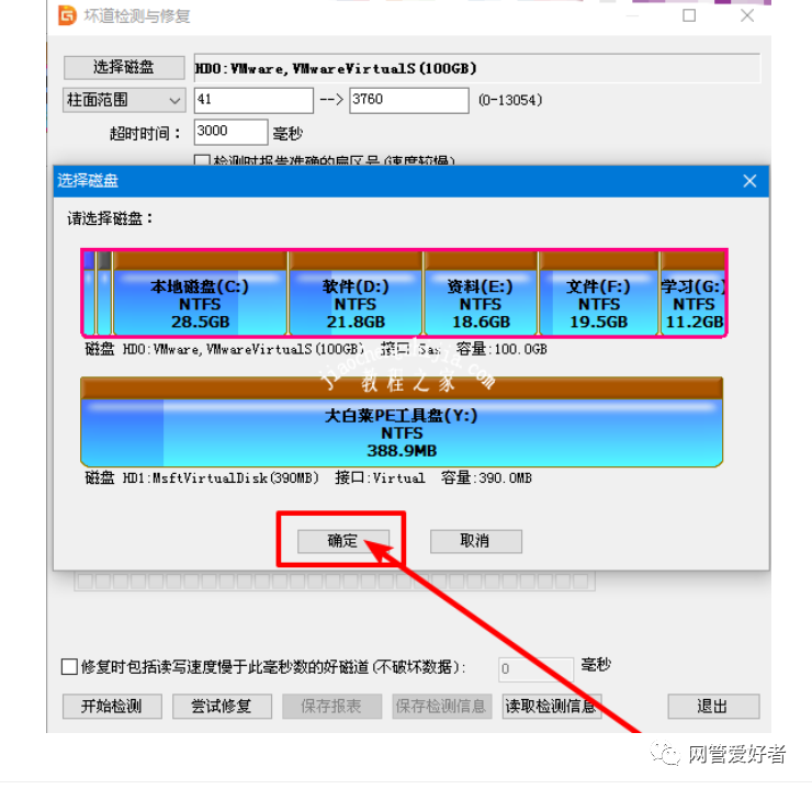 6. 从磁盘列表中选择要测试的磁盘,单击 " OK " (此处使用虚拟机器,因此磁盘选项界面有所不同)。
