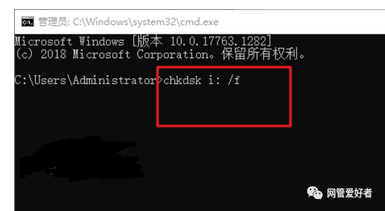 3. 将 " chkdsk i:/f " 丢入开放命令提示窗口,并点击恢复的返回键,其中 " i: " 指U-disk。