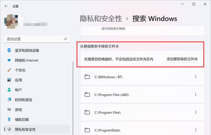 选择 Windows 后, 用户向下浏览菜单, 并选择 [从增强搜索的文件夹中排除] 选项 。